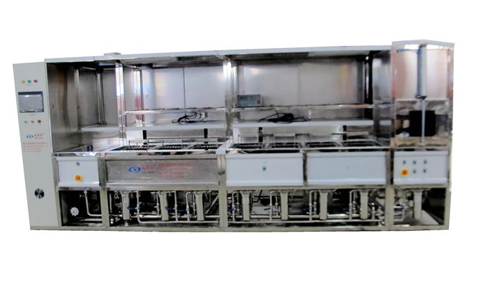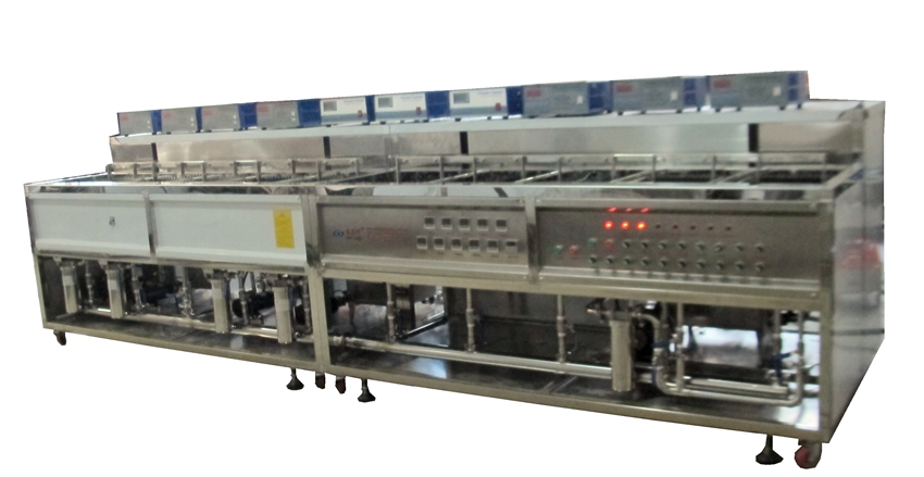 該超聲波清洗機主要由超聲波發(fā)生器、換能器、清洗槽、儲液槽、循環(huán)過濾系統(tǒng)、自動恒溫加熱系統(tǒng)、拋動系統(tǒng)、抽氣罩、冷水機、機架、電控柜等組成。