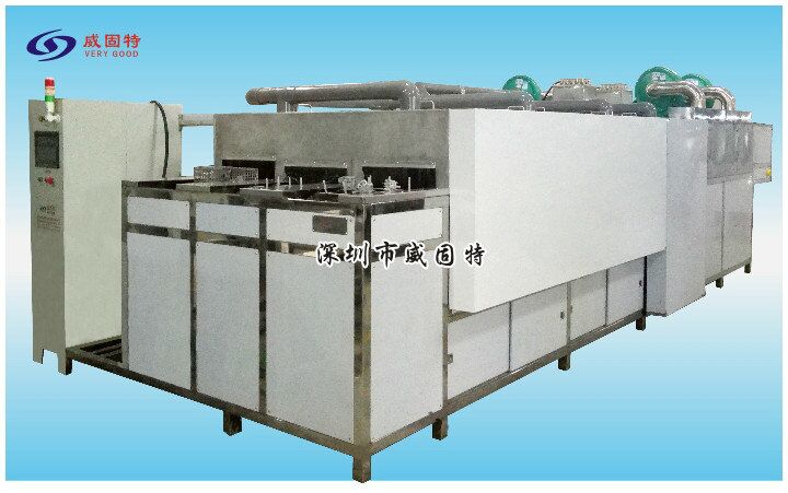 全自動通過式噴淋電池鋁殼清洗機該清洗機主要由進料段、清洗腔室、超聲波清洗腔室、市水噴淋漂洗、市水漂洗腔室、4個儲液槽、循環(huán)過濾系統(tǒng)、自動恒溫加熱系統(tǒng)、隧道爐干燥系統(tǒng)、出料段、不銹鋼網(wǎng)帶輸送系統(tǒng)、機架、電控柜等組成。